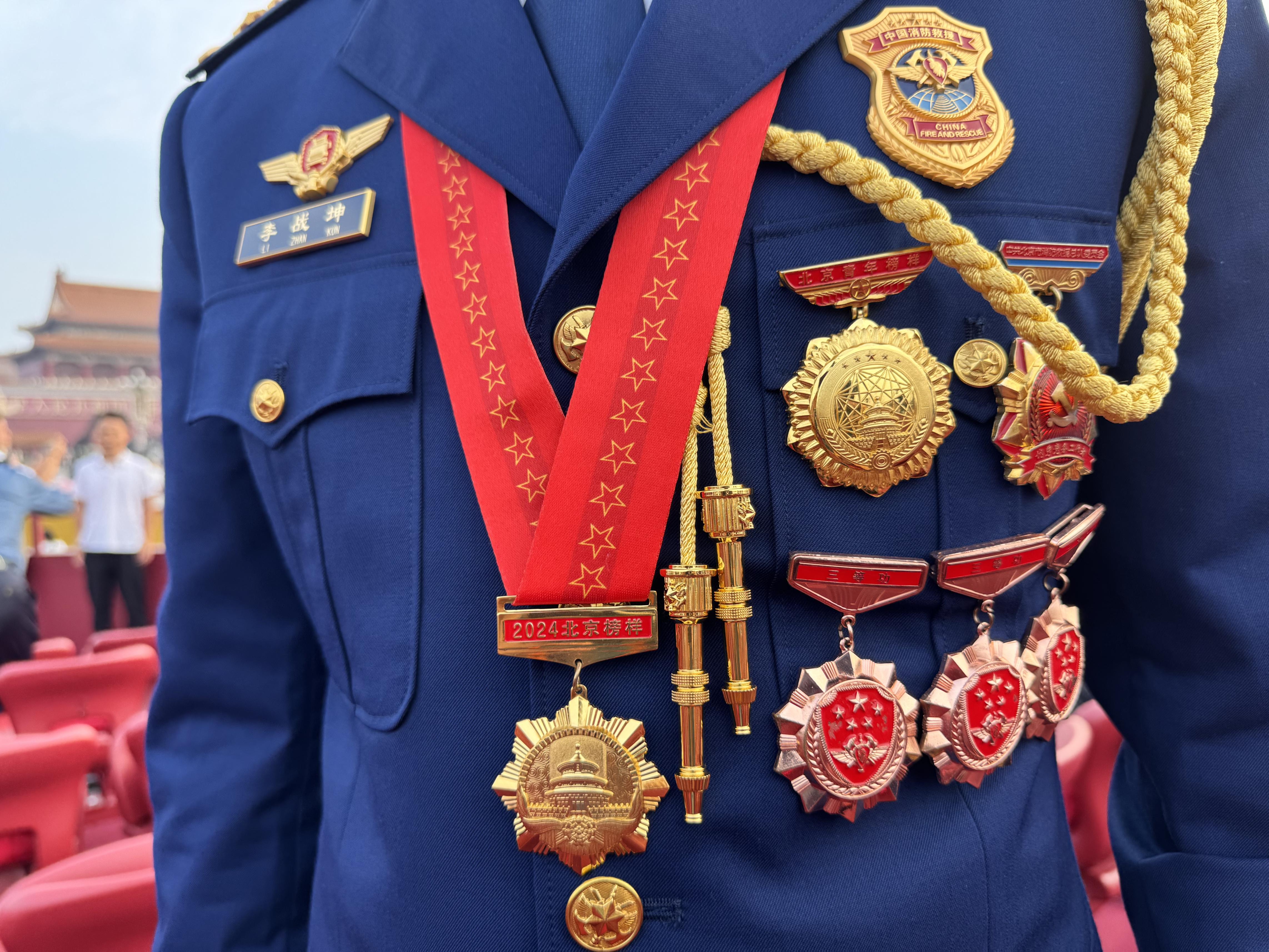 记者看到,李战坤胸前的勋章除了有2024北京榜样和北京青年榜样奖章,还有两枚三等功勋章。面对镜头,李战坤激动地说道,“此刻站在天安门广场,我心中充满了对祖国的热爱和对先烈的缅怀之情。”